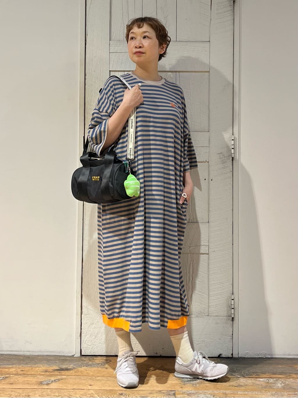 フラボアパークの人気ワンピースから、夏らしいボーダー柄が登場! 締め付けのないリラックスした着心地のカットソーワンピは、もはや夏の必需品ですよね。 ゆったりと見えすぎないよう、ブラックのバッグを引き締めポイントにしました。 さり気なくバッグに付いた「パーキー」のチャームにも注目!