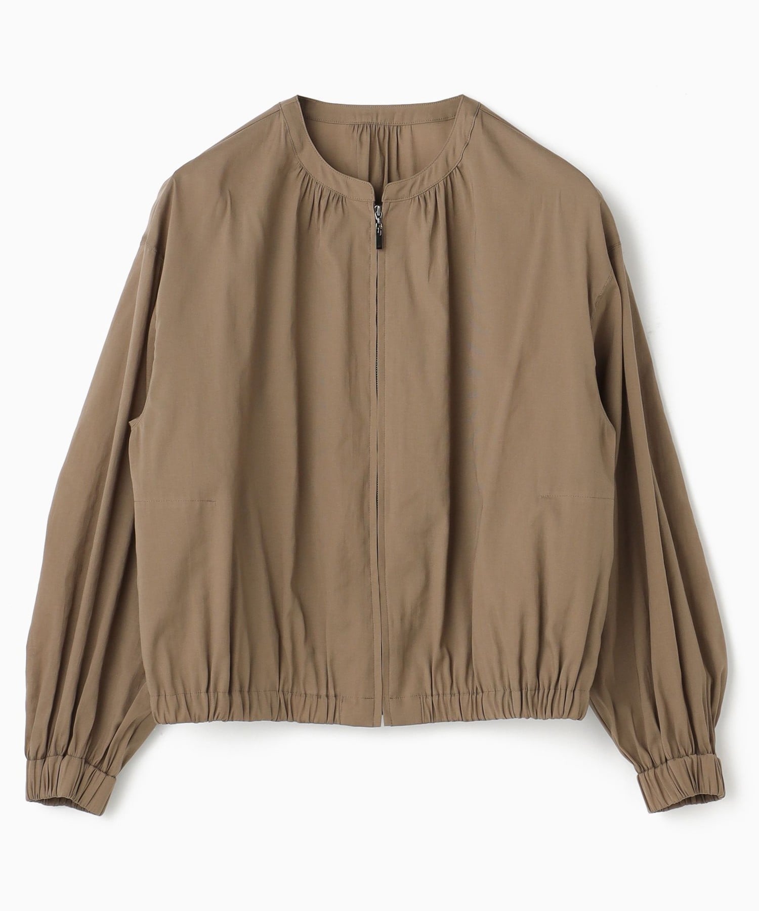 モカカラーが上品なブルゾンは、ギャザーディテールとシアーな素材感が女性らしい一枚。軽い着心地でラフに羽織っていただけます。