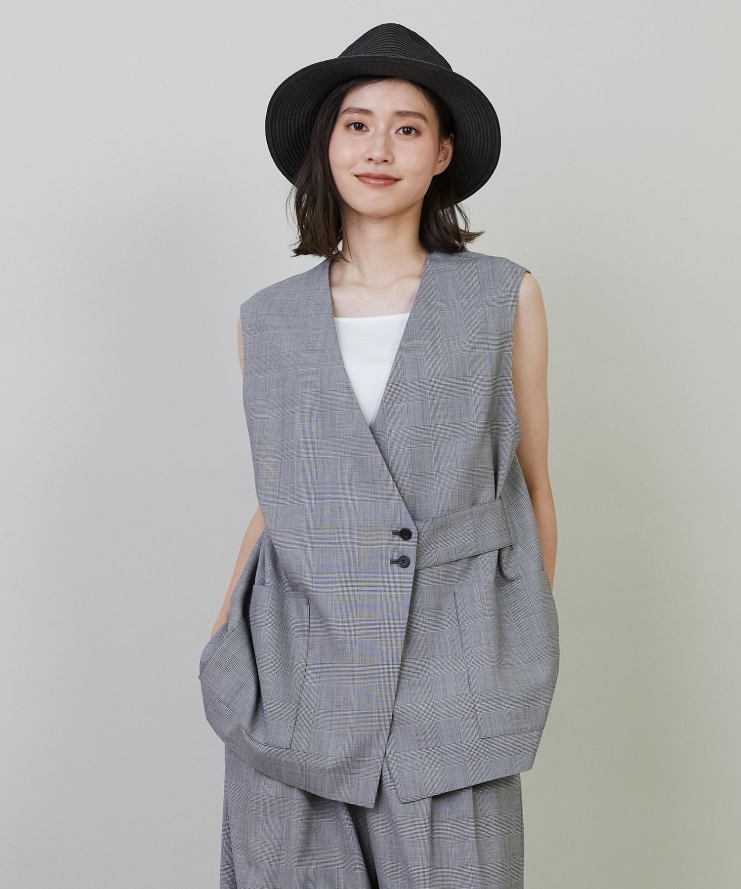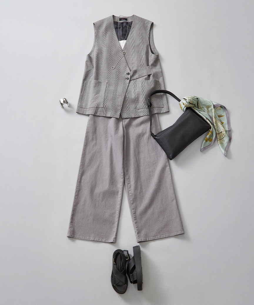秋のマストアイテム「チェック柄」のジレが登場しました。リラックス感のあるボクシーシルエットなので、新作のワイドデニムとも好相性です。