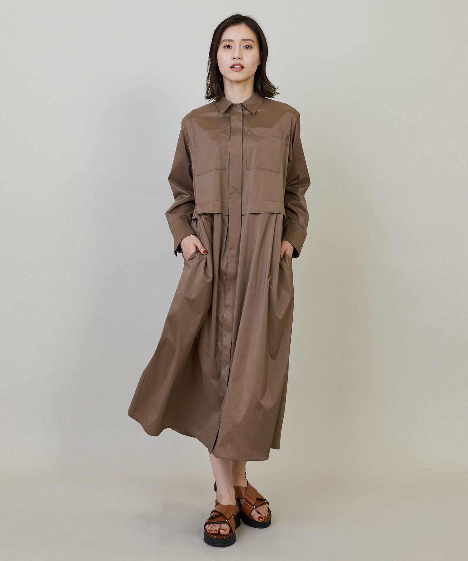 コンパクトな身頃から広がるスカートがフェミニンな印象のワンピース。軽さが魅力のタフタ素材なので、羽織りとしても活躍します。