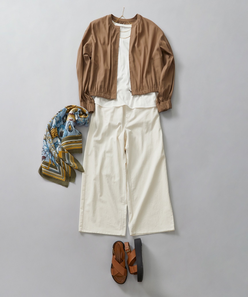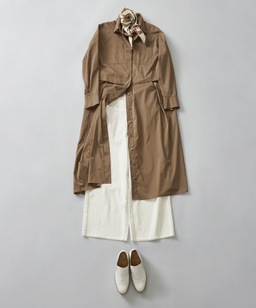 ホワイトデニムとレイヤードして、同系色のスカーフで彩りを添えれば、秋のムードを感じさせるスタイリングに。