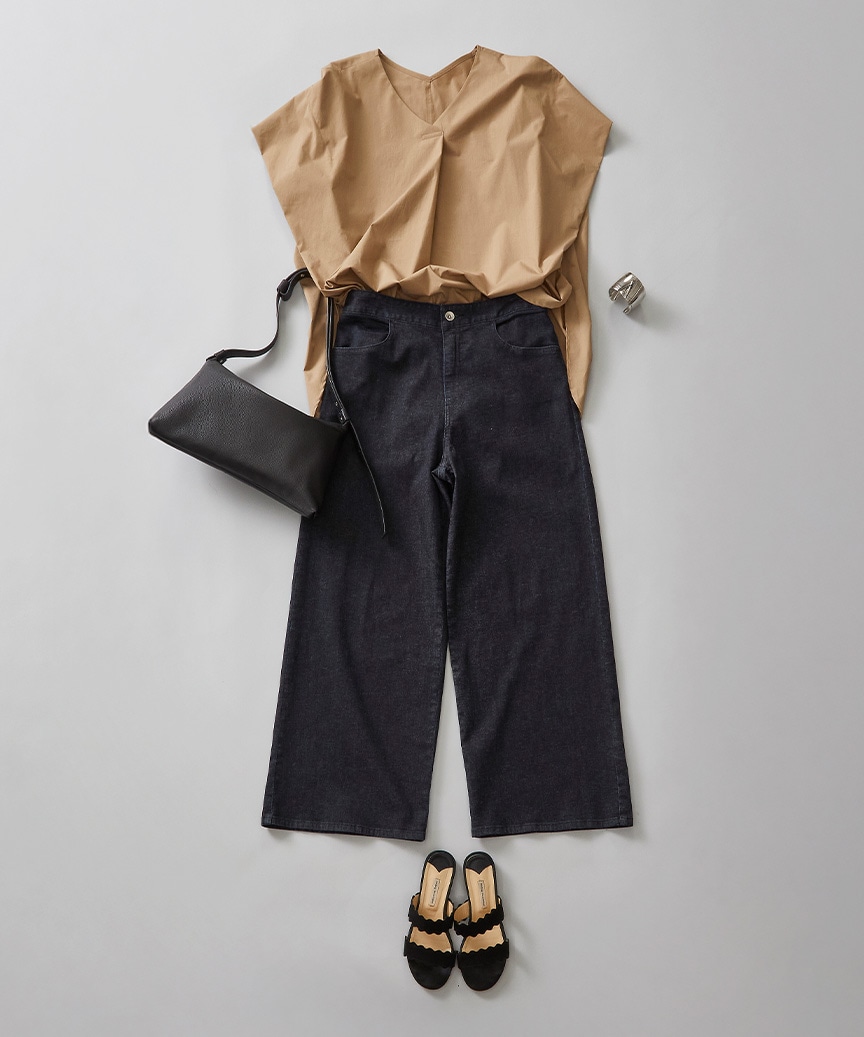 ワイドストレートシルエットのデニムと合わせて、キレイめカジュアルな着こなしに。
