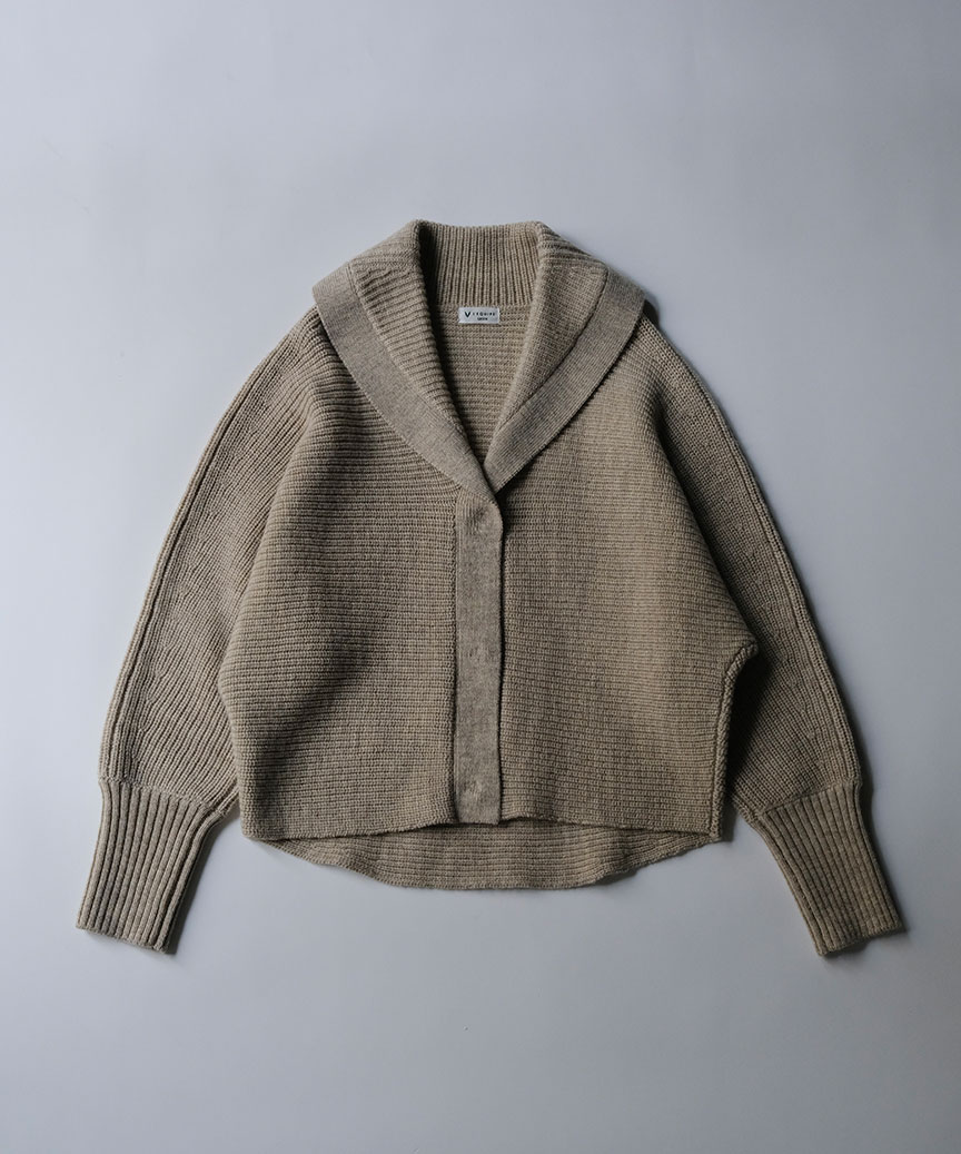 ゆったりしたドルマンスリーブのハーフジャケットです。身頃続きのショールカラーが襟元もカバーしてくれます。袖口リブでたくし上げた時にも魅力的なフォルムでスタイリッシュに着て頂けます。