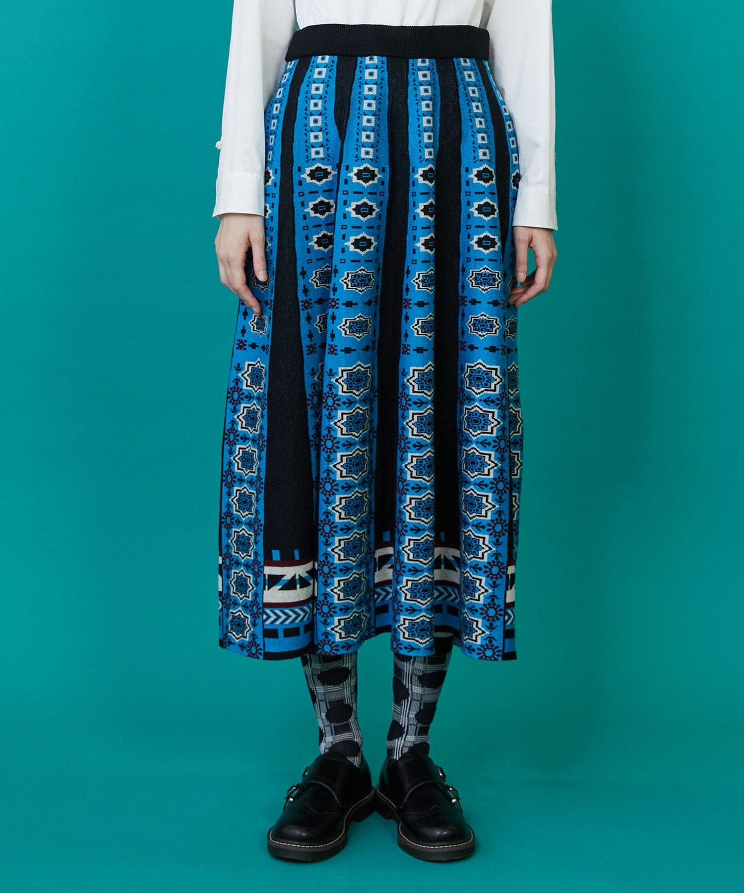 鮮やかなブルーが映える、主役級ニットのセットアップコーデ。東ヨーロッパのタイル柄をモチーフにした目を惹くデザインは、着るだけで華やかな印象に。同柄のスカートを合わせてセットアップ風に着こなせば、上品さと遊び心が両立した、フラボアらしいニットスタイルが完成。