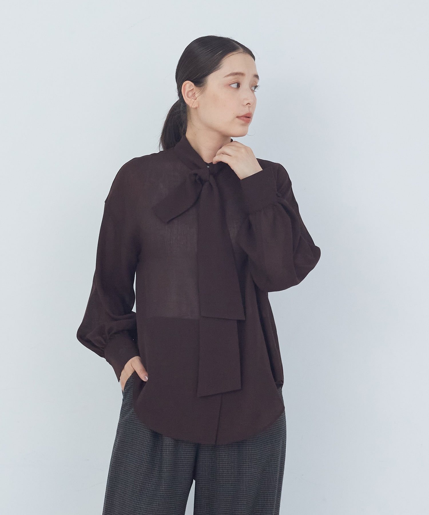 落ち感のあるボウタイブラウスとふんわりとした