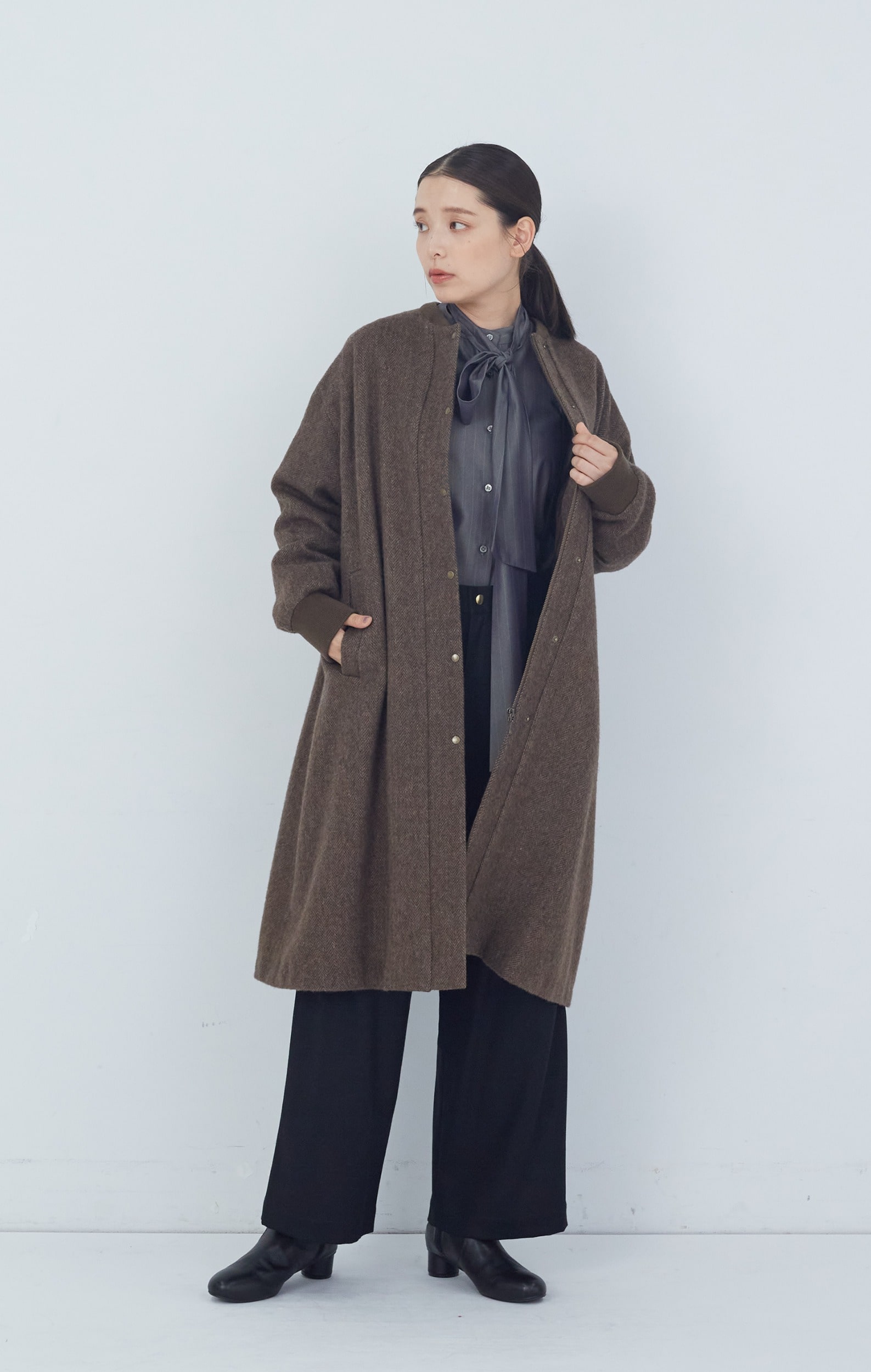 襟ぐりと袖口にウールの編み立てリブを付けたハーフコート。