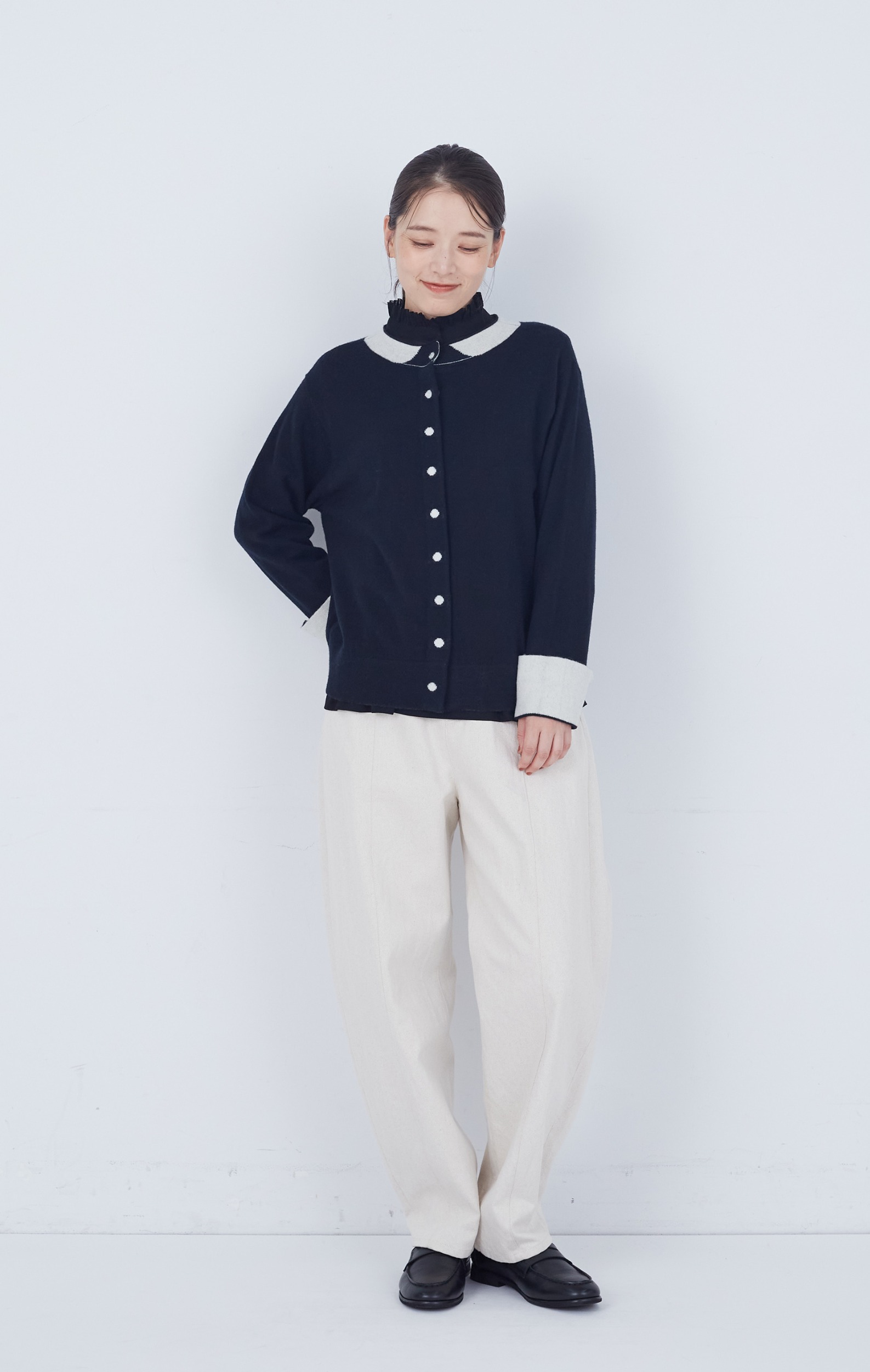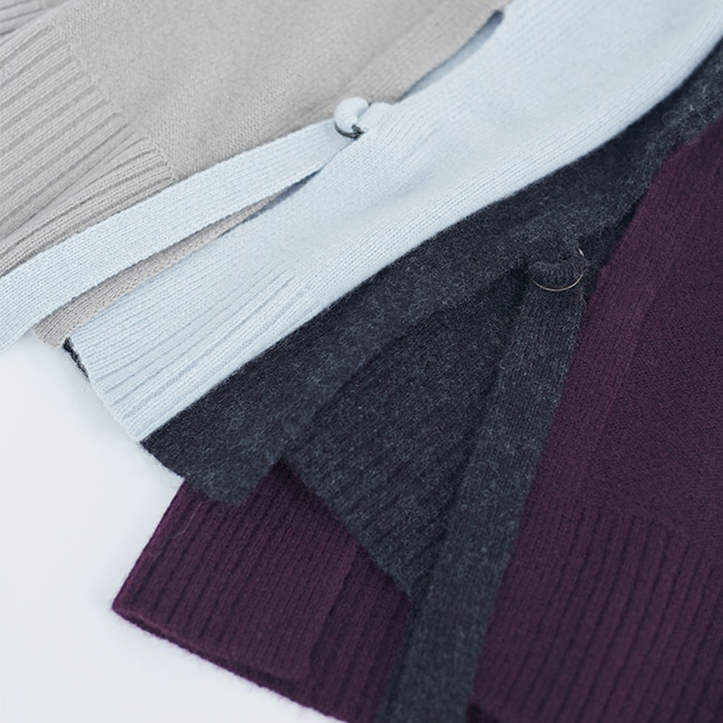 ボタンをトロンプルイユ風に仕上げた前後着用ニット。