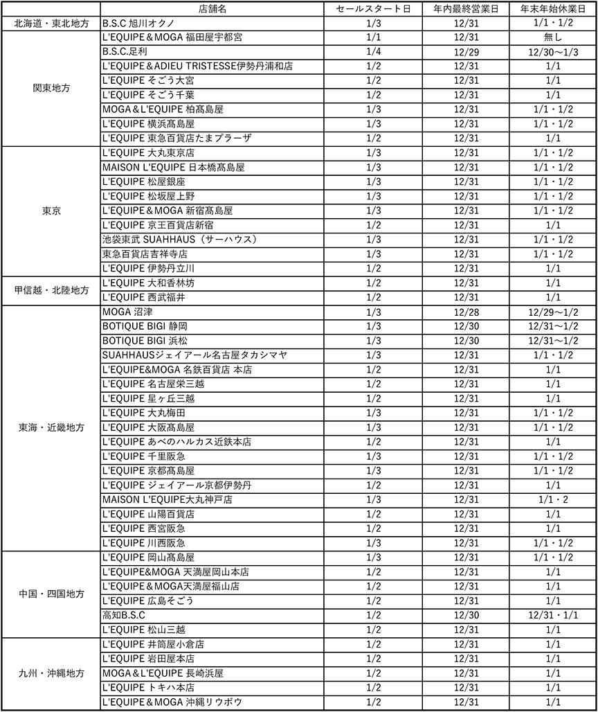 各店舗の年末年始の店舗休業日とセールスタート日をご案内いたします。