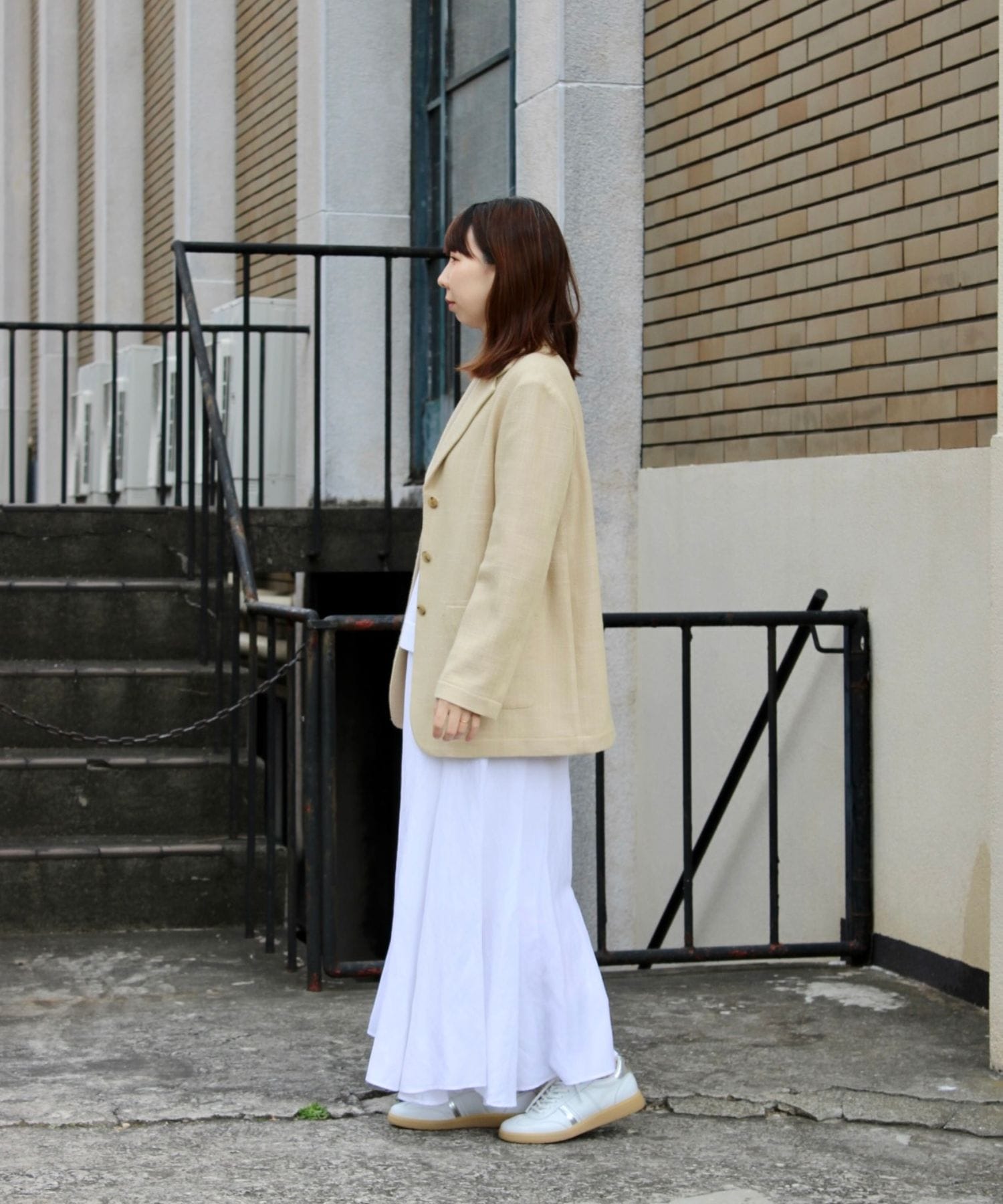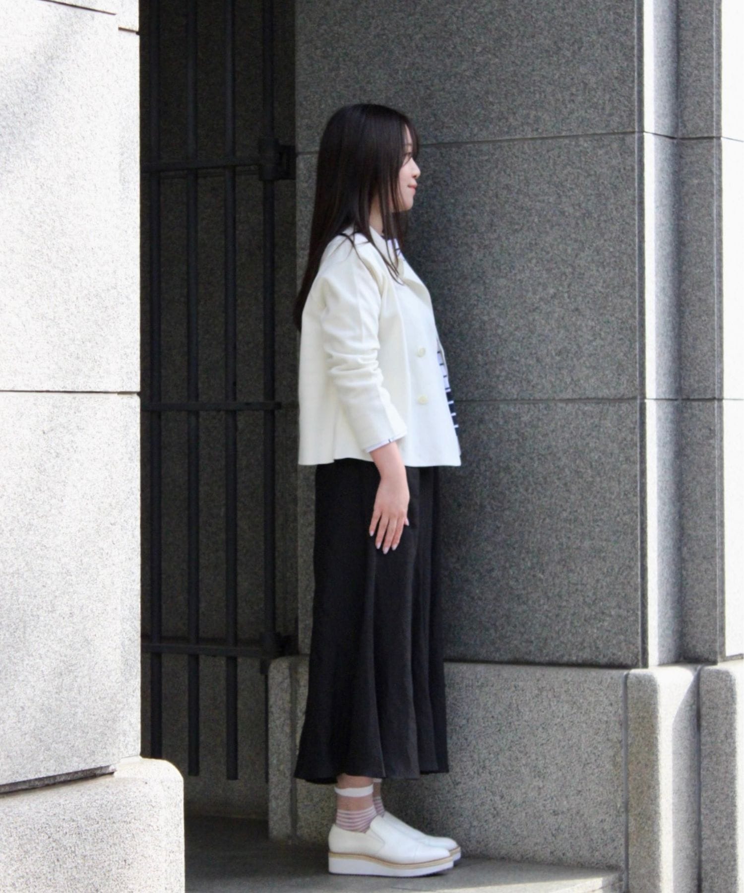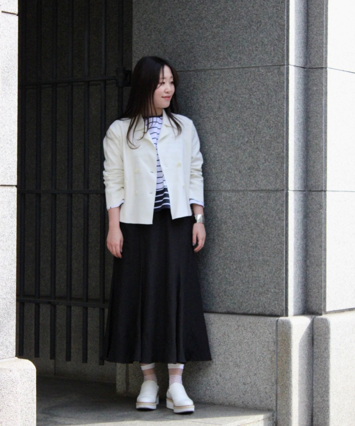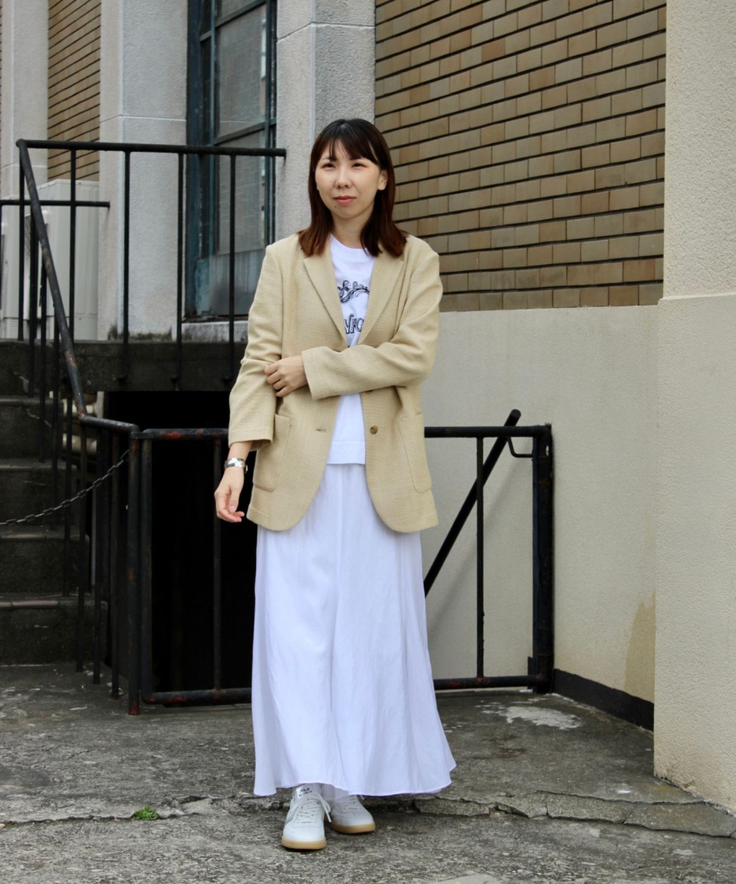 ジャケットを主役にしたかったので、ホワイトコーデに羽織ってみました。スカートの軽やかさが全体の印象を女性らしくしてくれます。Tシャツ合わせでよりカジュアルなスタイリングに。