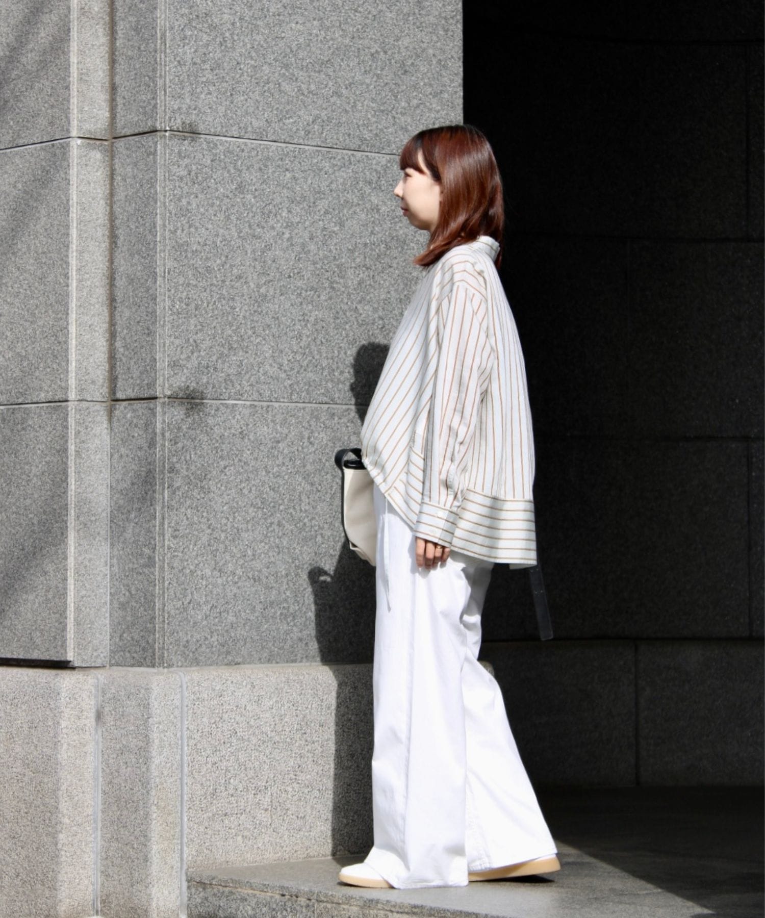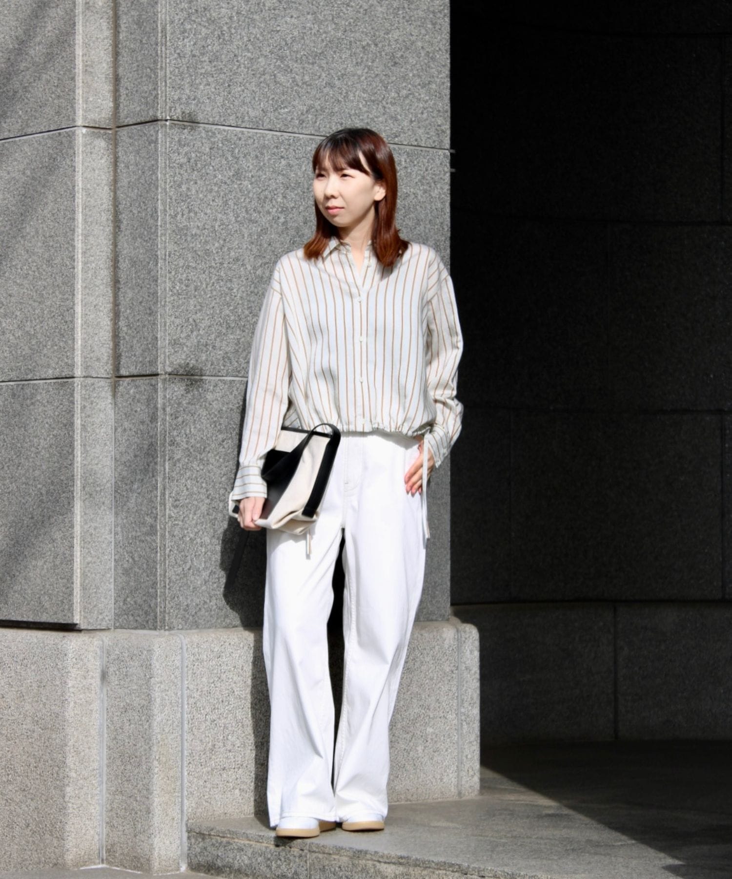 スニーカーやキャンバス地のバッグと合わせた、ベーシックなシンプルコーデ。ブラウスのシルエットが特徴的なので、ワイドデニムと合わせて華やかさを意識しました。