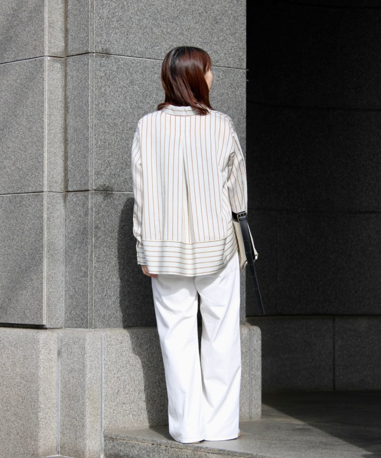 ベーシックカラーを好まれる方にも春コーデの差し色としてチャレンジしやすい色合いです。フロントを開けて羽織りとしてもお召しいただけるので、一枚で主役になり着回しできるブラウスをお探しの方にもぜひ。
