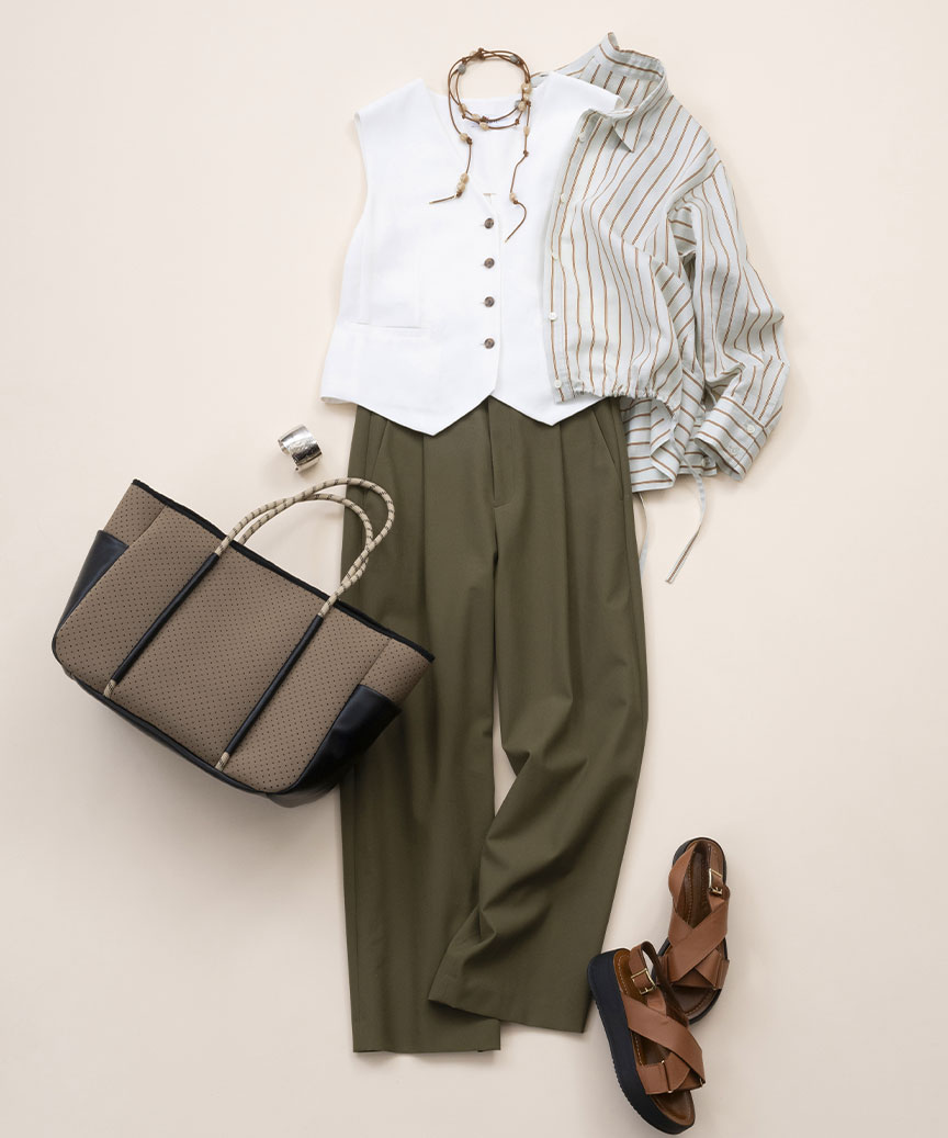 シンプルなパンツスタイルをアップデートするベスト。ジャケットのイン、ワンピースに重ねたり… この春夏はベストの着こなしを楽しんで。シャツの裾はドローコードでアレンジ可能です。