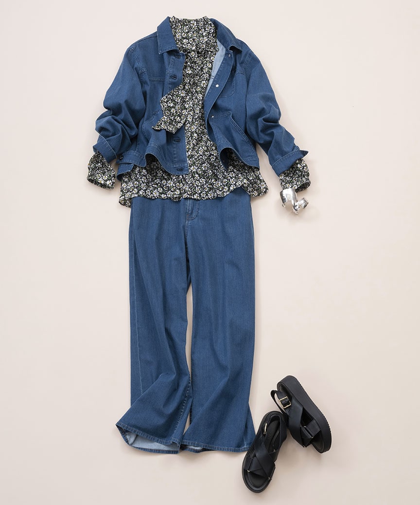 春はやっぱりデニムを楽しみたい。プリントのボウタイブラウスを合わせれば程よくモードでエレガントに。柔らかさと適度なスレッチ性があるオリジナルデニムは着心地の良さも魅力。