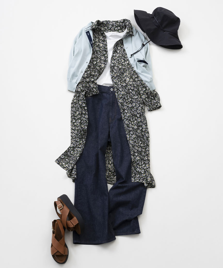 レトロな小花柄が可憐なプリントワンピースを羽織としてアレンジ。新作のデニムでマスキュリンな印象をプラスして。ミントグリーンのカーディガンはシルク混のなめらかさと、ポケットの裏配色がポイント。