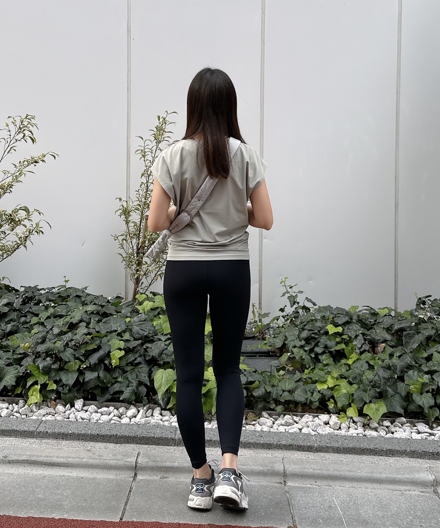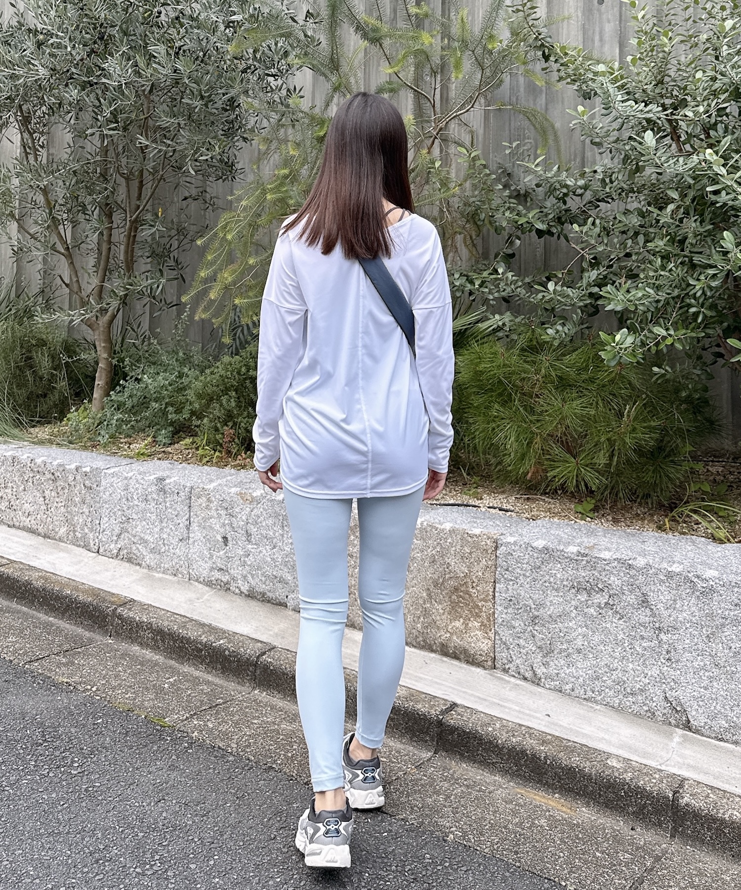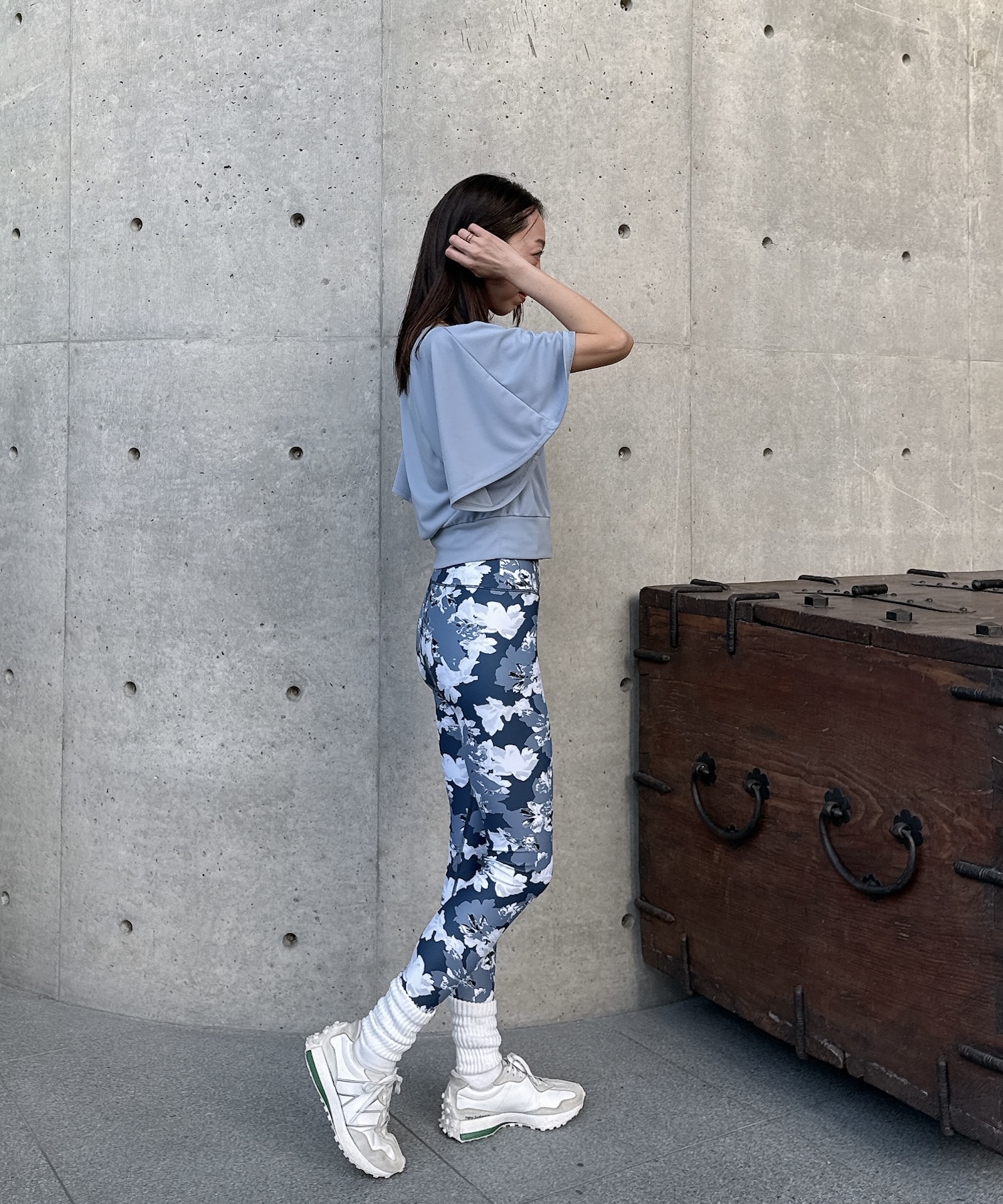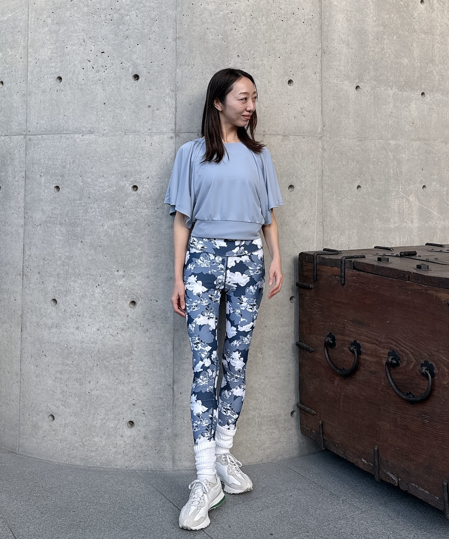 トップスはゆったり、レギンスはフィット感のあるシルエットで、メリハリのあるバランスに仕上げています。