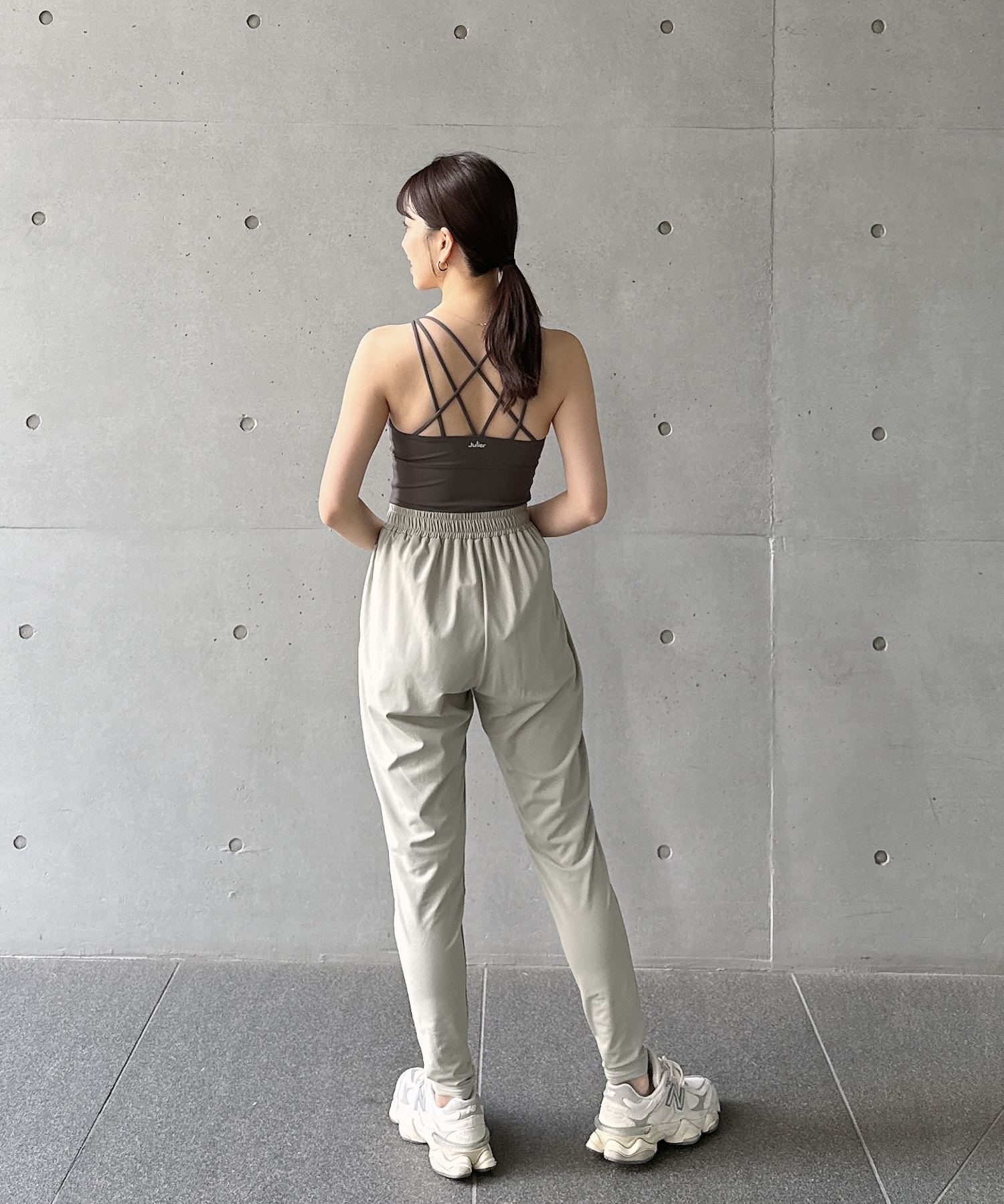 グレーのブラトップとライトカーキのギャザーパンツを組み合わせた、ニュアンス配色のワークアウトスタイル。
