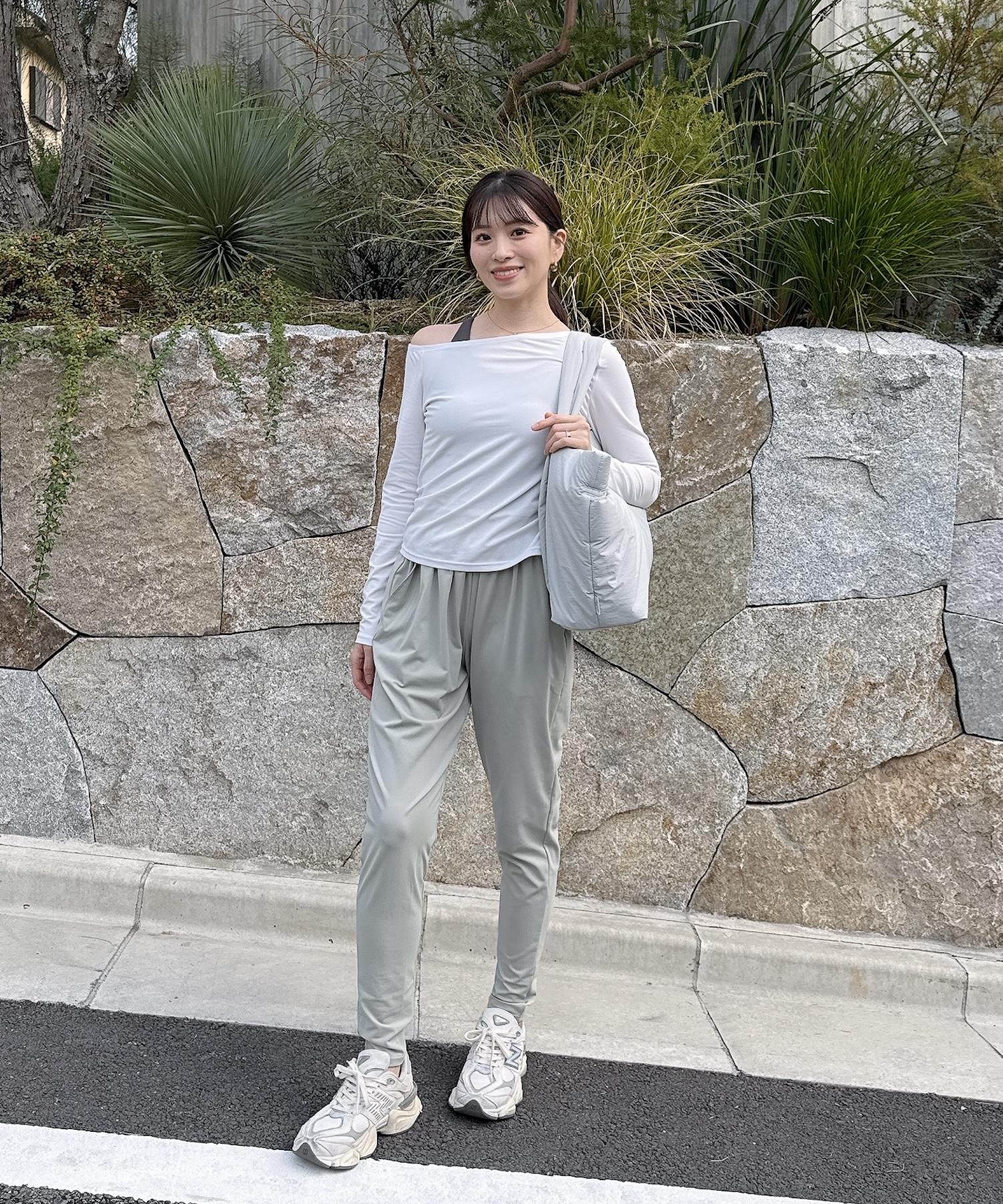 スタジオの行き帰りから街歩きまで対応できる、汎用性の高いスタイルです。
