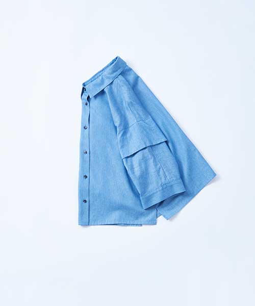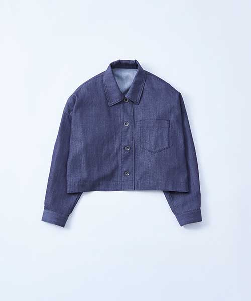 光沢感と落ち感のあるデニム調の素材を使用し、きれいめな印象に仕上げたシャツです。クロップド丈でワンピースやどんなボトムともバランス良く着て頂けます。同素材のワンピースとセットアップもおすすめです。