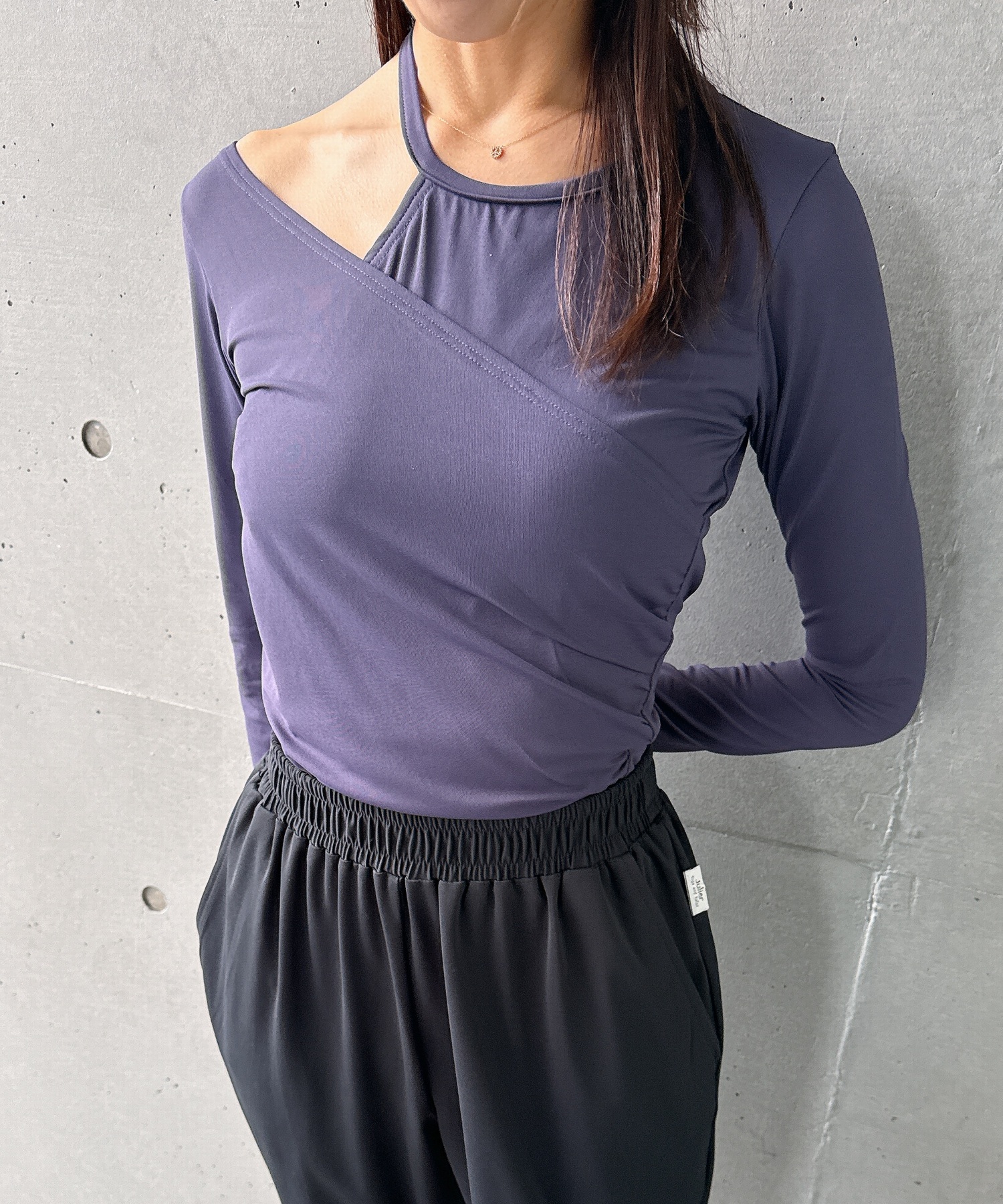 斜めに入ったネックラインが印象的なトップス。